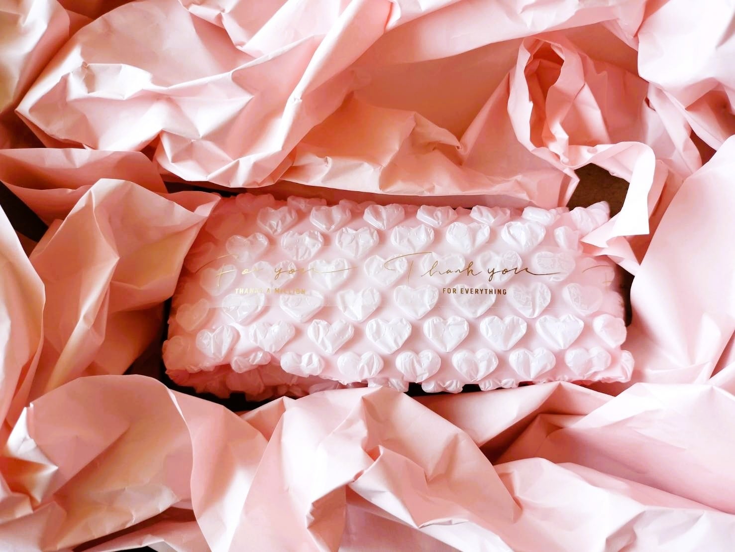 ✿淡いピンク色のハート柄緩衝材に包んで丁寧に梱包